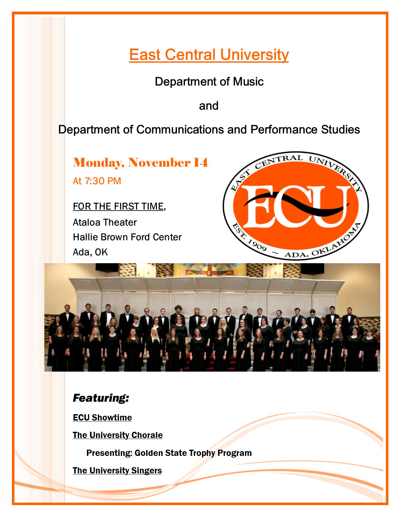 The East Central University Department of Music and Department of Communication and Performance Studies will present a choral concert on Monday, Nov. 14, at 7:30 p.m. in the Ataloa Theatre of the Hallie Brown Ford Fine Arts Center.