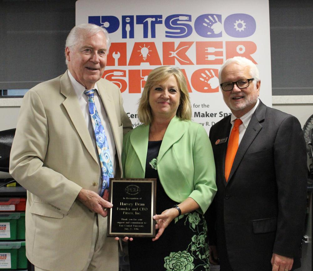 Dr. Harvey Dean (left), founder and CEO of Pitsco, Inc., is presented with a plaque by Dr. Brenda Sherbourne, dean of the East Central University College of Education and Psychology, during the dedication of the new Pitsco STEM Maker Space Lab in the Lanoy Education Building on July 27. Also pictured is ECU President John R. Hargrave. Dean, a 1965 ECU graduate, donated the materials and tools for the new and innovative lab, designed to integrate the STEM subjects - science, technology, engineering and math - into the school curriculum. Thanks to the new initiative at ECU, pre-service teachers will not only experience STEM in an exciting way, but also become even more effective teachers by using these tools.