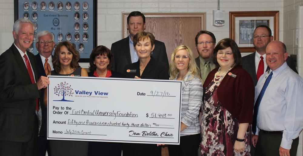 The East Central University School of Nursing recently received a $51,943 grant to renovate part of the school into a simulation lab, which will assist nursing students. The funds came from the Valley View Health and Wellness Foundation, which awards grants to organizations that promote area residents’ health and well-being. Presenting the check at far left is Tom Bolitho, of the Valley View Foundation. Also pictured on the front row (from left) are Leah Lyon, ECU director of sponsored programs and research; Lori Wightman, president of Mercy Hospital, Ada; Dr. Katricia Pierson, ECU vice president for academic affairs; Buffy Lovelis, ECU Foundation, Inc. chief operating officer; Dr. Carolyn Lewis, ECU director of nursing and Todd Essary, Mercy Foundation Director. On the back row are: (from left) Dr. Gerald Williamson, ECU advancement officer; Jeremy Bennett, ECU director of information and technology; Dr. Carl Gilbert, dean of the College of Health and Sciences and Jay Horne, ECU Foundation, Inc. chairman.