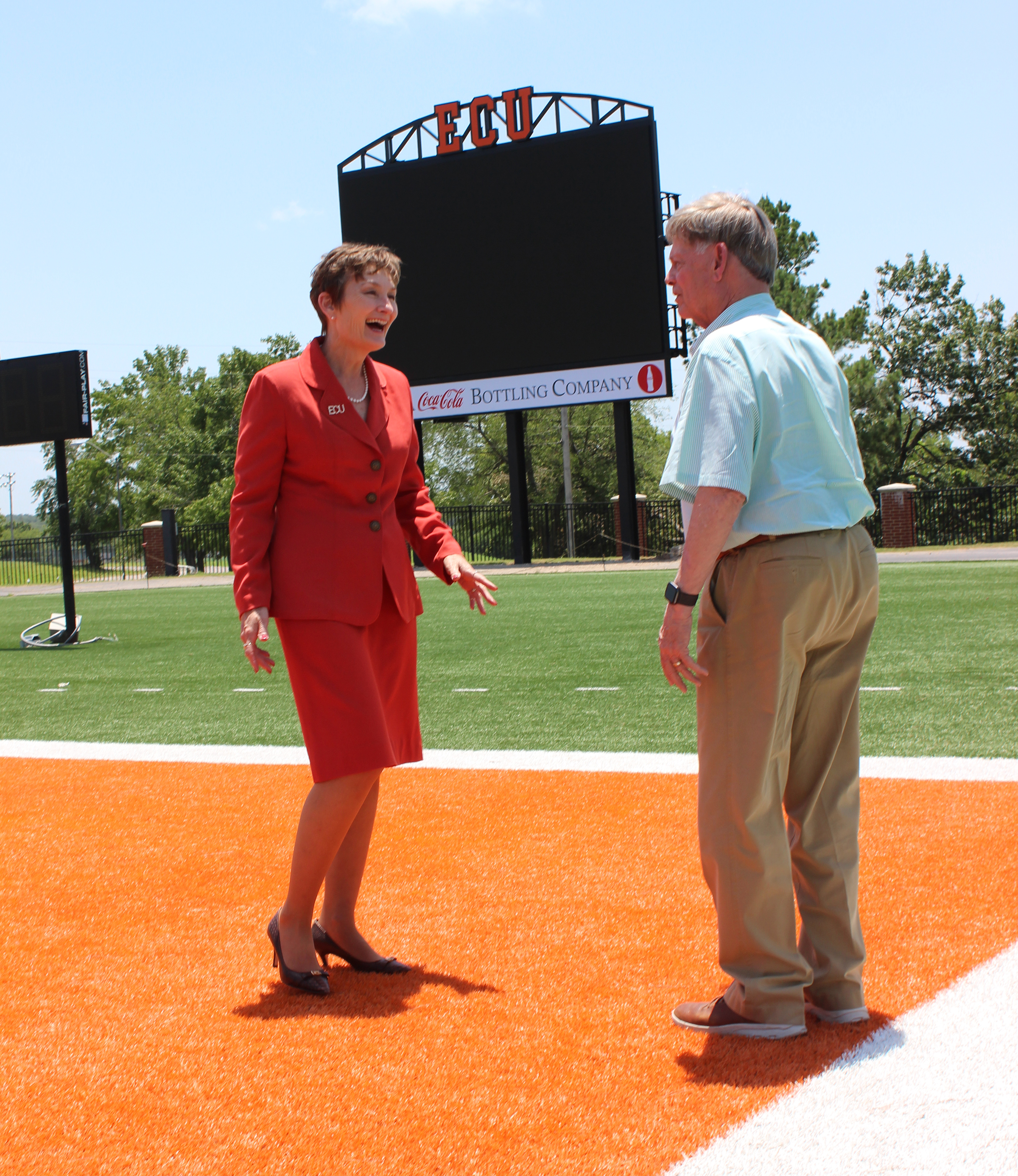 With the efforts of ECU President Katricia G. Pierson and Ada Coca-Cola Bottling Company, fans attending games at ECU’s Koi Ishto Stadium will enjoy a new $310,000-plus video scoreboard. When the university was renewing its contract with the Ada Coca-Cola Bottling Company earlier this year an agreement was reached to add this video scoreboard sponsorship opportunity for football fans.