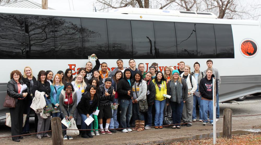 Local high school students and teachers gather before boarding an East Central University bus to return to Pauls Valley after participating in Pauls Valley High School Day at ECU on Jan. 25 [WEDNESDAY]. They met with President John Hargrave, Wendell Godwin, dean of ECU’s School of Business, and other ECU officials to learn about admission to ECU, applying for scholarships and life on campus. The students were treated to a tour of the Hallie Brown Ford Fine Arts Center, the Kerr Activities Center and Pesagi Residence Hall. They had lunch in ECU’s Taff Cafeteria and visited with former Pauls Valley students in the Bill Cole University Center before heading home that afternoon.
