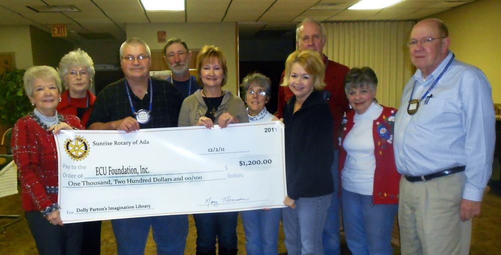 Members of the Sunrise Rotary Club of Ada display their $1,200 donation in support of the Dolly Parton’s Imagination Library for children of Pontotoc County. Through the efforts of local groups such as Sunrise Rotary, Smart Start South Central is able to continue the valuable literacy program that sends an age-appropriate book each month to children up to 5 years old. Presenting the donation are Sunrise Rotary board members Nancy Thomason (front row, from left) Harrel Harbin, Cathy Battles, Suzanne McFarlane, Cindy Byrd, Mary Pfeffer, Jack Womble and (back row) Ann Barton, Dwight O'Dell and Angus McFarlane. DPIL is administered by Smart Start South Central, the ECU Foundation Inc. and East Central University.
